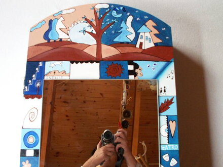 Vyrobená zo smrekového dreva v dielni Zelenej pani:), maľovaná akrylovými farbami a prelakovaná. Zakomponované zrkadlo o rozmere 30cm x 30 cm. Skrinka sa uchytáva na stenu šróbmi a hmoždenkami.