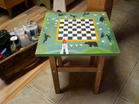 Malý šachový stolík s témou pre Horára a jeho dámu:) pre deti nielen na šach, na preskakovanú, dámu, atď... Môže slúžiť aj ako príručný stolík pre dospelých na kafe, čaj do interieru....komu ako sa hodí...Smrekový masív, akryl, lak. Veľkosť: 41 cm x 41cm x výška 43cm